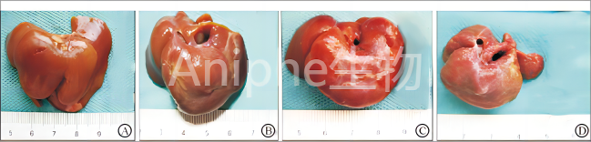 正常组肝脏表面呈鲜红色,表面光滑柔软,无结节和颗粒,肝缘锐利,形态与大小均正常。